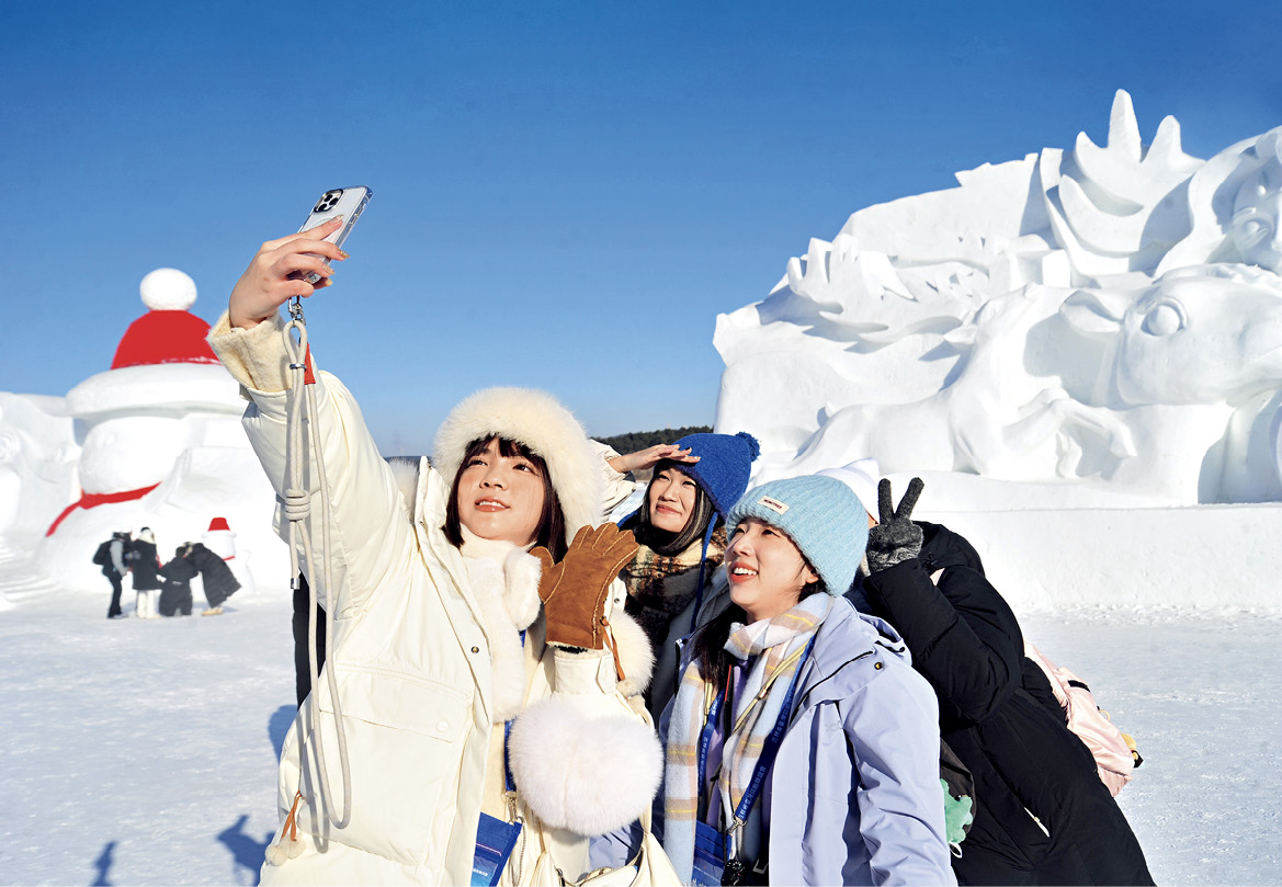 2025年1月16日,吉林长春,台胞青年在雪雕前打卡。当天,2025年全国台联第三十一届台胞青年冬令营吉林分营在长春开营